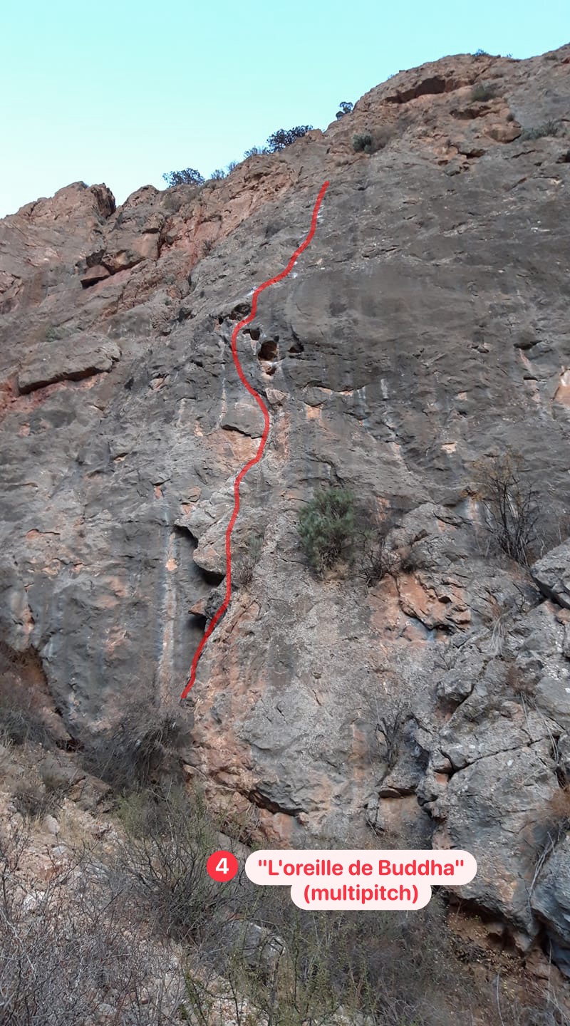 - 1 multipitch route “L’oreille de Buddha” on top of the grove (go right around the crag)
